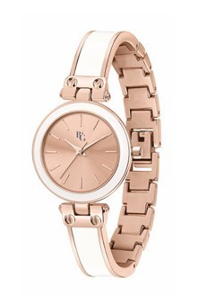 Montre B&G precious bangle pour femmes . Montre en bicolore rose et blanche, avec bracelet en metal. Horloge avec cadran rose avec boîtier rose et blanc et index rose.